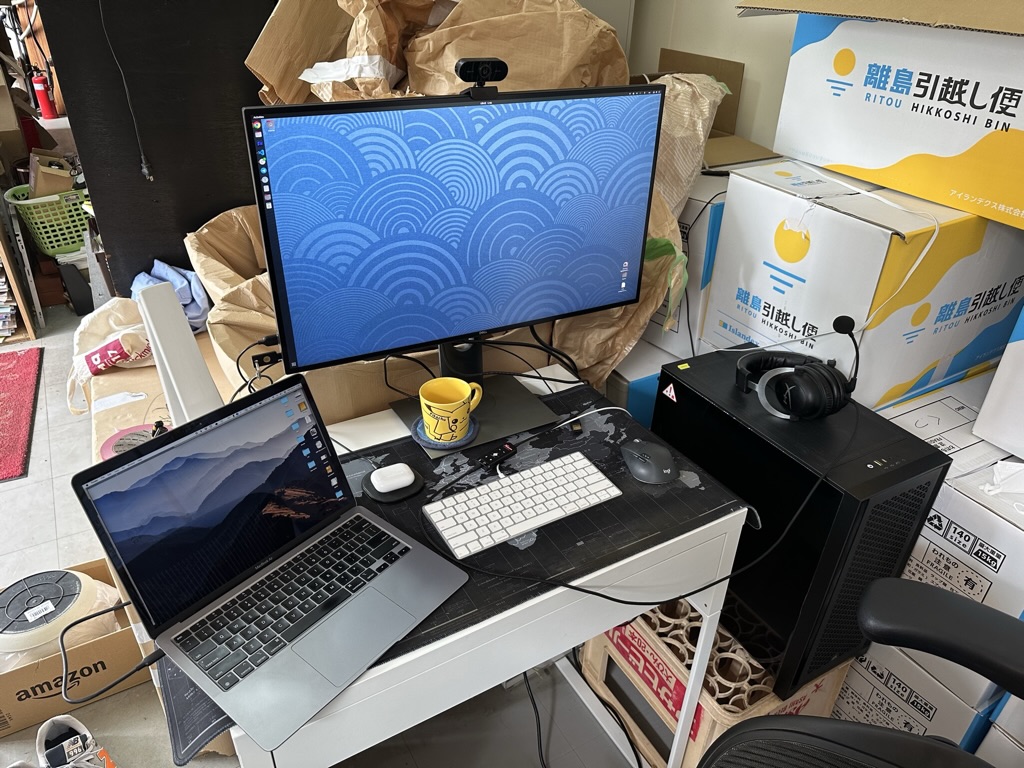 仕事場は義父の車の整備工場の余っていた部屋を借りて、引越し荷物に囲まれながら妻と一緒にパソコンを置いて通常通り仕事しております。