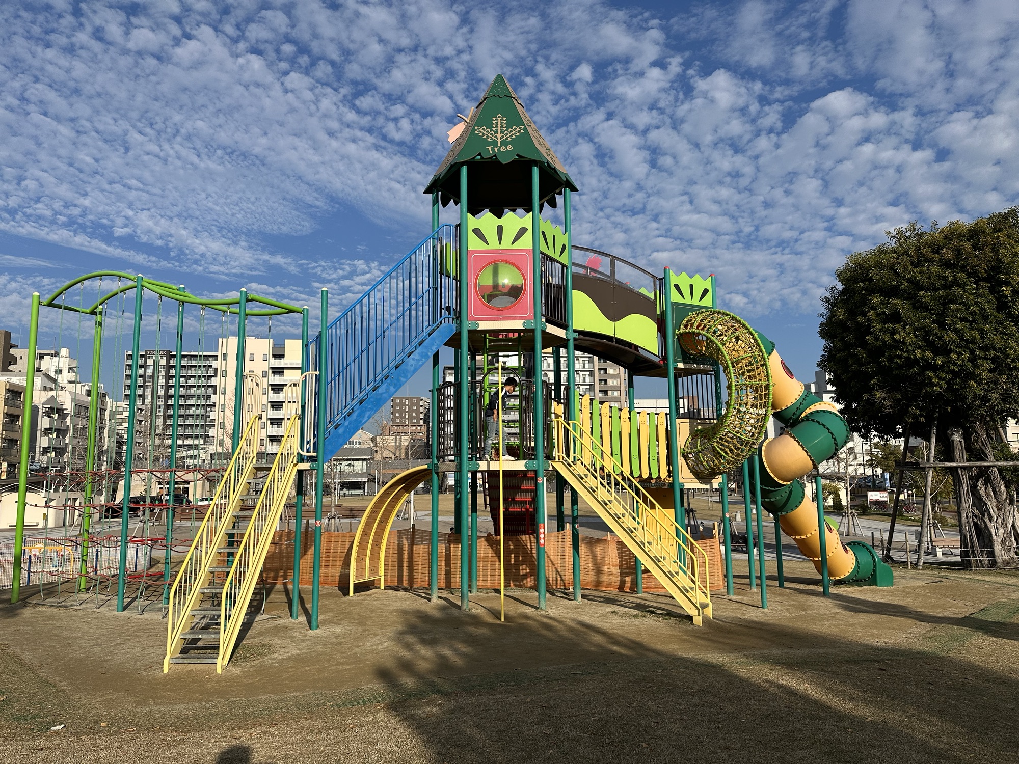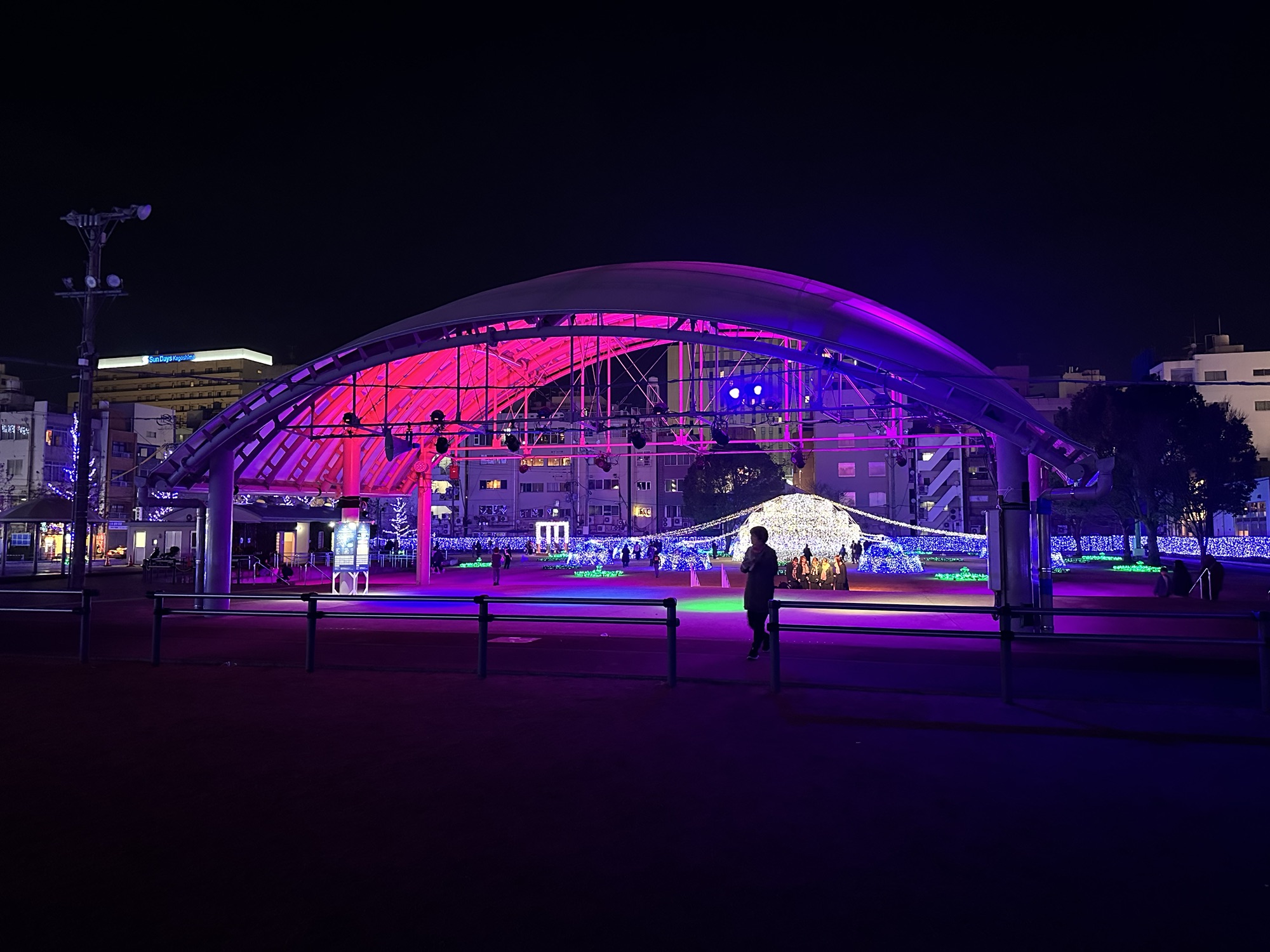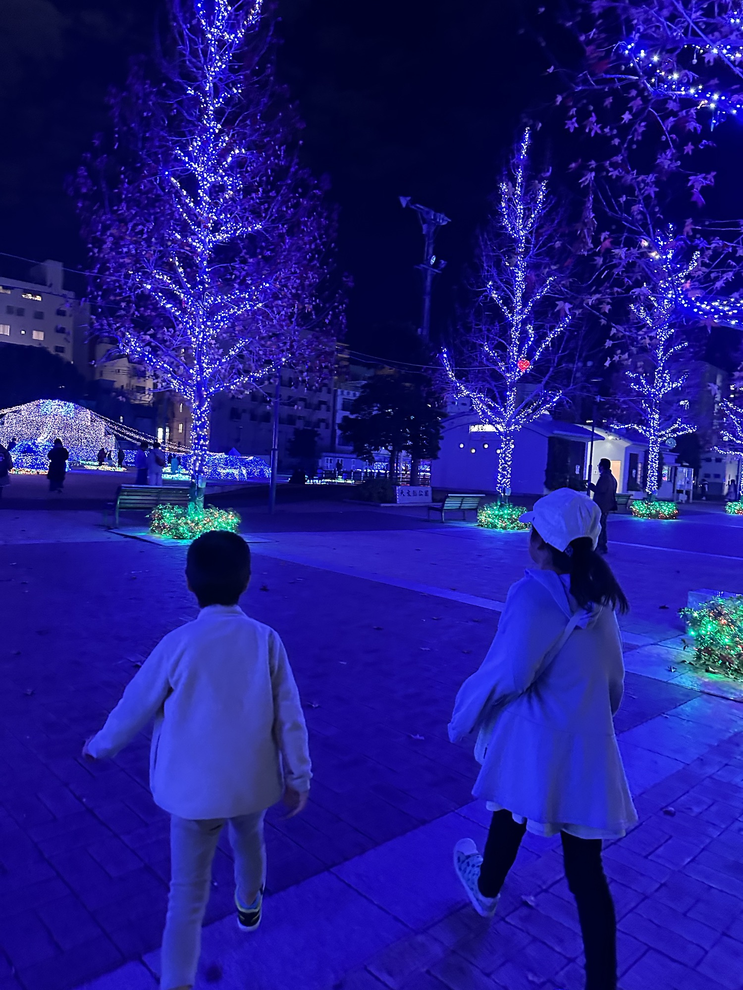 - 2日目: 朝は温泉に入り、甲突川緑地の公園で遊びました。お昼前に市電で天文館のホテルに移動して一旦荷物を預け、加治屋まちの杜公園で遊んでから、ぶらぶらショッピング。私と娘は市立天文館図書館にも行ってみました。夜は天文館公園のイルミネーションを見て、また遊んでいました。
