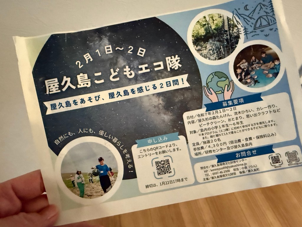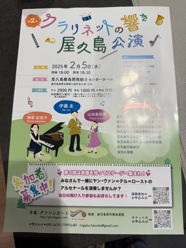 息子は「屋久島エコ隊」という宿泊イベントに、娘・妻・義母はNHK交響楽団の方などが出演する「クラリネットの響き 屋久島公演」というコンサートにも行っていました。こういった催し物は学校でチラシをもらってくるのですが、知ることができてありがたいです。